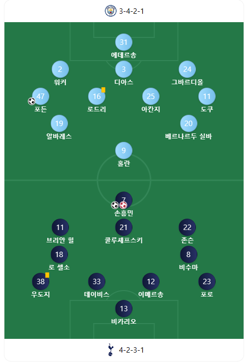 홀란이 골대 앞에서 슛 찬스를 놓치고, 맨시티의 골대를 맞히는 불운, 그리고 골키퍼의 선방 때문에, 전반 후반에 멋진 패스플레이 1골 만을 더 내주고 2 대 1로 전반을 겨우 마칠 수 있었다.