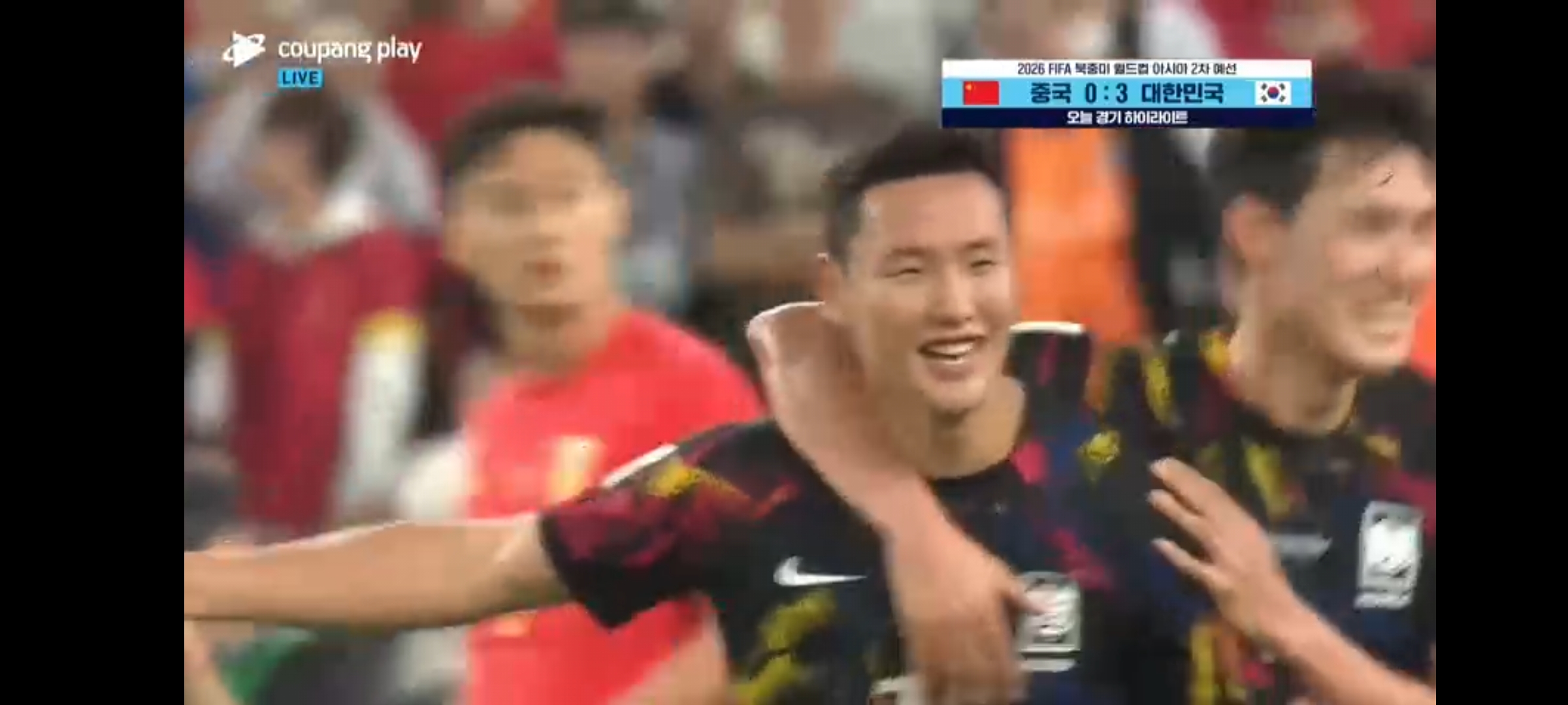 3번째 골 후 정승현 (쿠팡플레이 생중계 화면 캡쳐) 중국 선수들의 거친 플레이들도 있었지만, 많이 노쇄화된 중국은 한국의 상대가 되지 못했다. 일본을 제외하면 아시아에서는 크게 걱정 없이 축구를 봐도 될 것 같다.