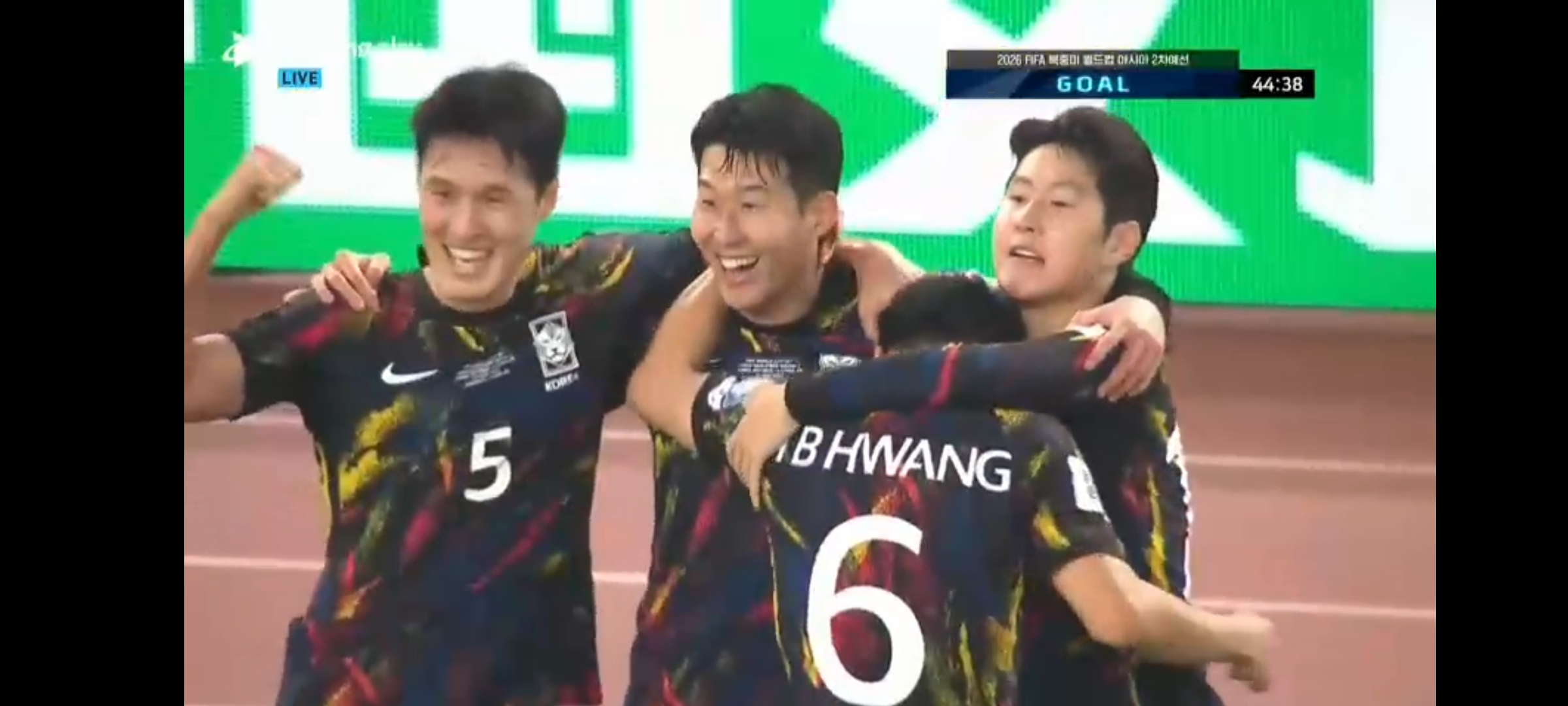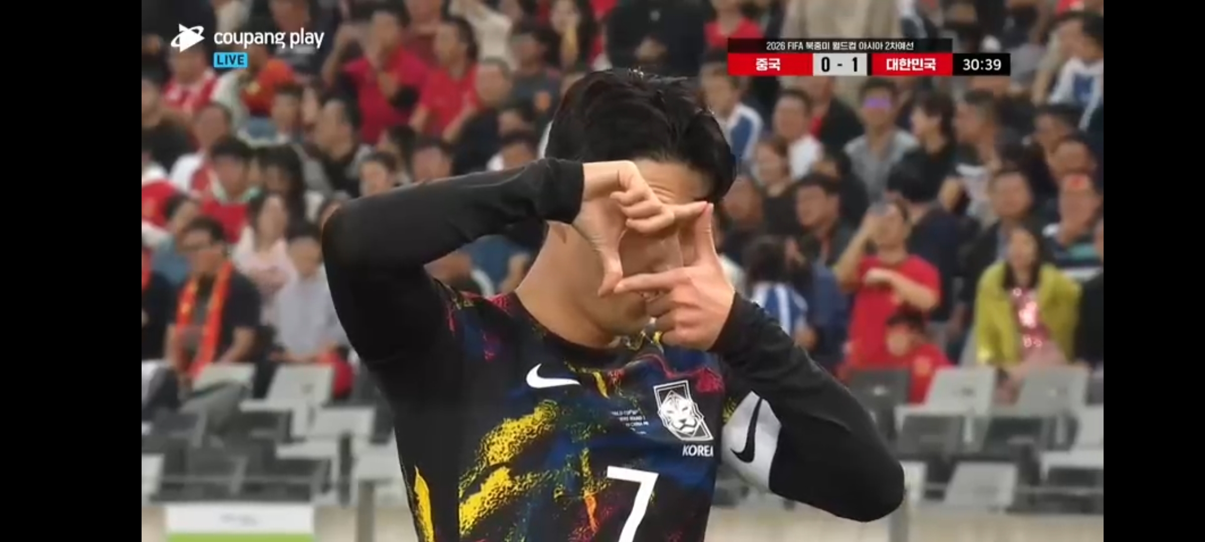 첫 골 후 손흥민 세리모니 (쿠팡플레이 생중계 화면 캡쳐) 다른 선수들의 컨디션도 좋았다. 이강인, 황희찬, 김민재, 박용우 등 피로감은 찾아볼 수 없는 열정적인 움직임이었다. 그리고 전반 후반에 두 번째 골이 나왔다. 이번에도 손흥민이었지만, 헤딩슛이었다. 좀처럼 보기 힘든 그의 헤딩슛~!