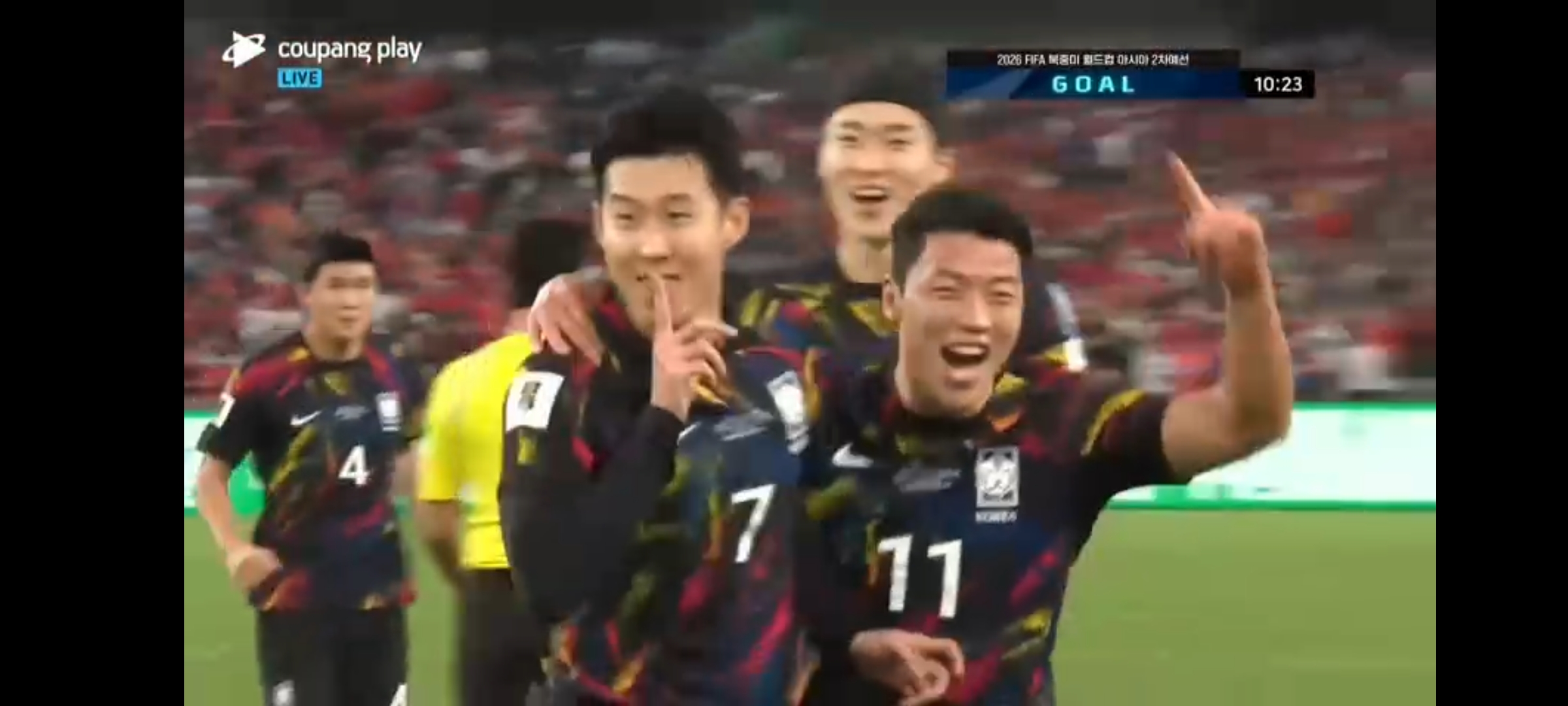 두번째 골 후 손흥민 (쿠팡플레이 생중계 화면 캡쳐) 이렇게 전반이 끝나고 후반이 시작되었고, 점유율을 비롯 모든 공격전반 data에서 월등히 앞선 대한민국은 경기를 지배하며 후반전을 끌고 가고 있었다. 그리고 후반 후반에 손흥민의 코너킥을 정승현이 헤딩슛으로 연결하면서 3 대 0이라는 멋진 스코어를 만들어냈고, 대한민국의 승리로 마무리되었다.
