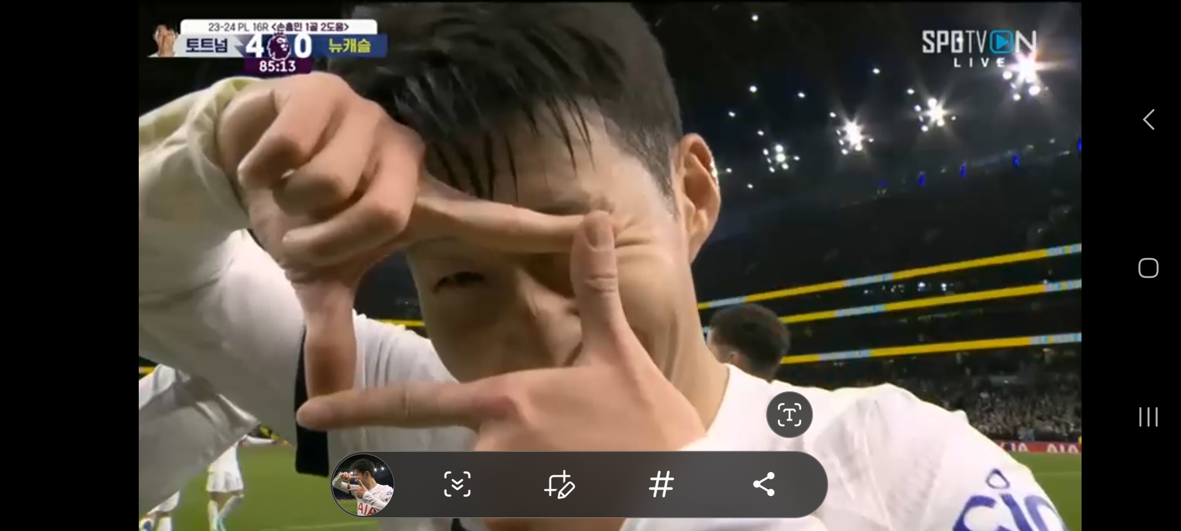 손흥민의 첫 골 도움장면 (SPOTVON 라이브 방송 장면)